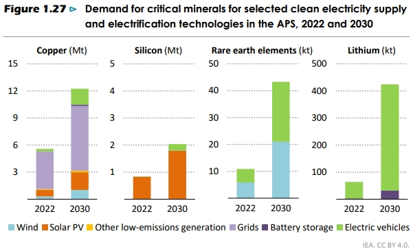 其中,在锂方面,IEA预测,到2030年,随着储能及新能源汽车领域的需求增长,锂的需求将是目前的5-7倍。