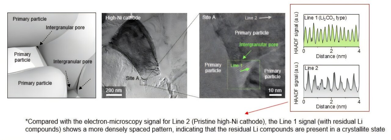研究团队利用高分辨率电子显微镜、氮吸附分析和电子能量损失谱等先进的分析技术,对正极材料进行了详细的研究。他们发现,残留锂化合物以晶体形式存在于颗粒间的晶粒间孔隙中,并证实这是导致电池性能下降的主要原因之一。