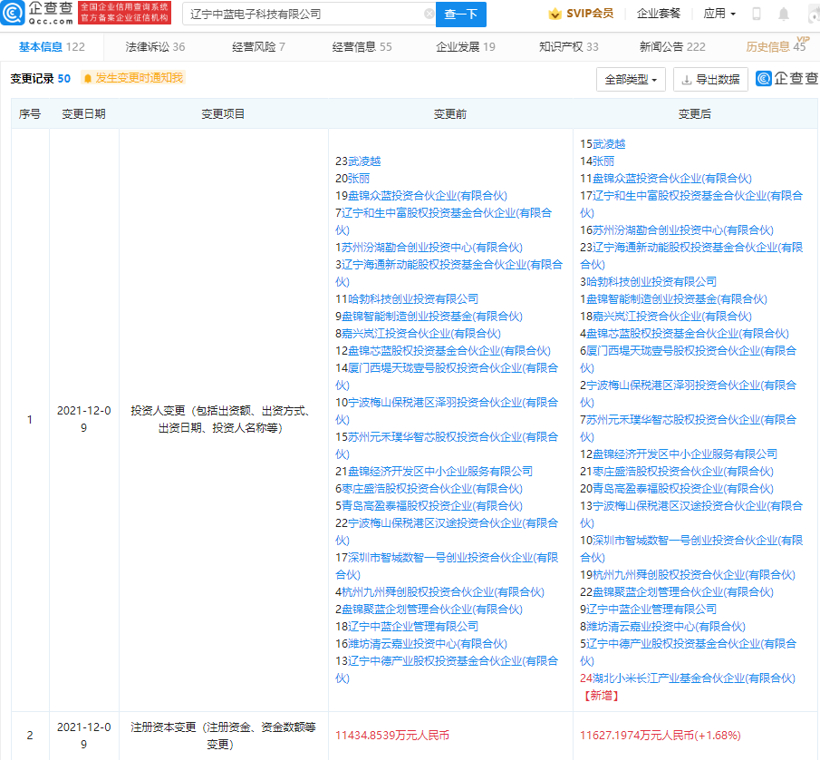 据企查查显示,12月9日,辽宁中蓝电子科技有限公司发生工商变更,新增湖北小米长江产业基金合伙企业(有限合伙)为股东,注册资本由1.14亿元人民币增加至1.16亿元人民币,增幅为1.68%。