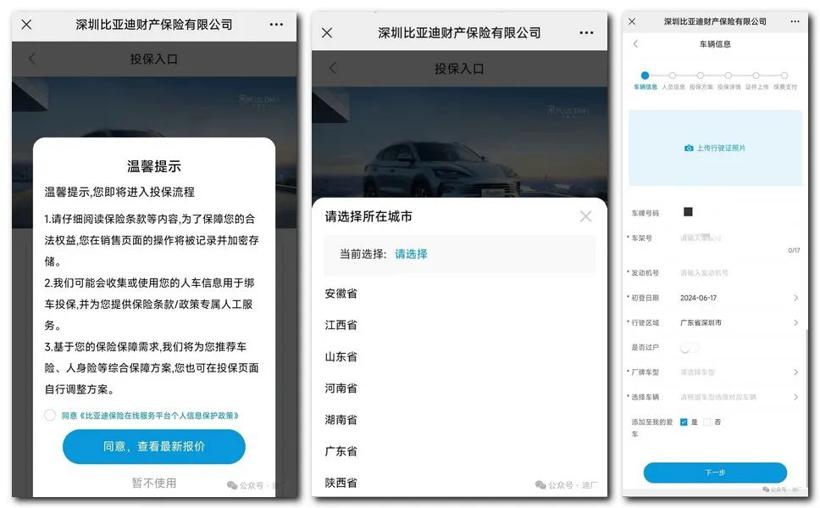 1、比亚迪保险投保入口正式开启,电子保单流出据公众号【迪厂】消息,比亚迪保险投保入口日前已正式开启,车主可依据所在城市,选择相应的保险服务。6月17日生效的一份电子保单,也流传至网络。