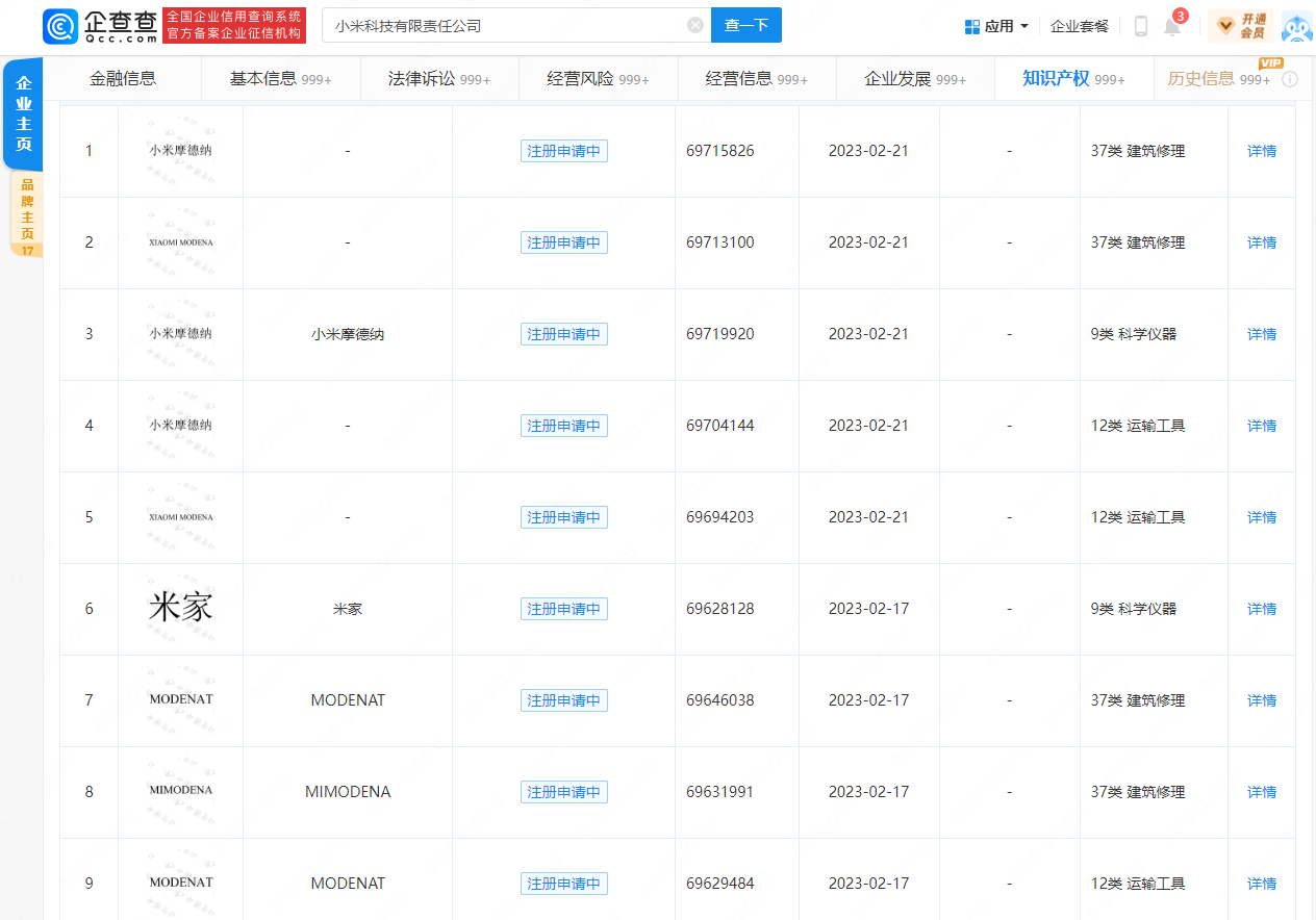 2月27日消息,据企查查显示,小米科技有限责任公司近日申请注册多枚“小米摩德纳”“MODENAT”“XIAOMI MODENA”“MIMODENA”图形及文字商标,国际分类含运输工具、科学仪器、建筑修理,当前商标状态为申请中。