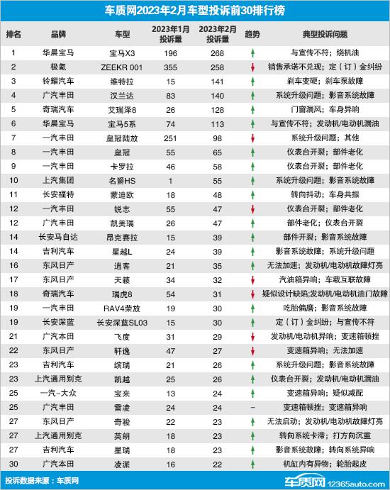 数据显示,本月车质网受理的有效投诉信息共涉及716款车型,其中投诉达两位数(含)以上的车型114款。此外,车质网本月共接到车企针对投诉的回复9,514条(含部分之前月份投诉的回复)。在去除投诉人因为车企解决得当而自愿申请撤诉的信息后,2023年2月投诉量前30的车系(车型)排名如下: