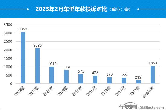 2月份,2020款、2021款和2022款车型的投诉量均突破千宗,其中2022款车型的投诉量时隔5个月重返3,000宗,环比上涨51.3%。2021款车型依旧排名第二位,投诉量持续高企,大幅领先于其余各年款车型。本月2023款车型投诉量保持着持续增长的态势,较1月份上涨62.9%,投诉增量来自于部分自主品牌车型。