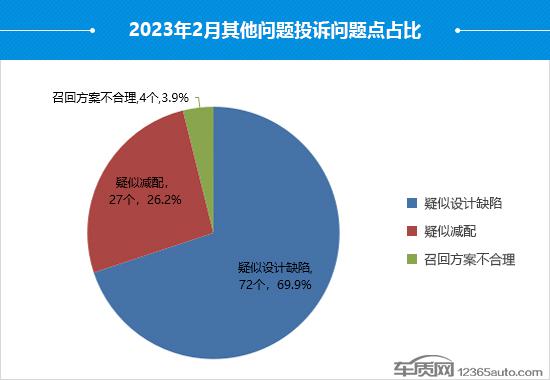 2月份,其他问题投诉量略有反弹,疑似设计缺陷问题的投诉量和投诉占比出现明显提升,其中占比较1月提高了19.9个百分点,投诉集中在部分美系品牌车型。