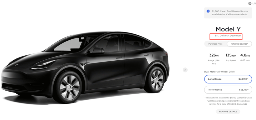 另外,特斯拉的另一款车型Model Y的长续航版本,预计交付时间也是在12月份。