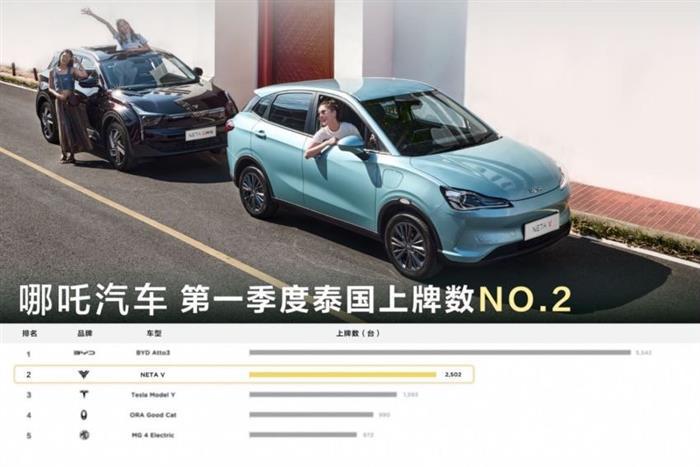 2023年5月,泰国AUTO LIFE官网公布2023年1-4月纯电车型泰国上牌量数据。其中,哪吒V以3066辆的上牌量稳居榜单第二,超过特斯拉,市占率达到16.5%。相当于在泰国每卖6辆纯电汽车,就有1辆是哪吒V。
