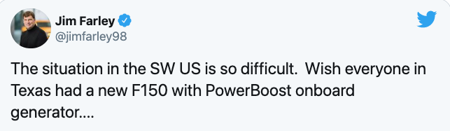 在F-150车主论坛上,其他一些车主也分享了自己类似的经历。人们在论坛上发布的照片也被转载到了Twitter上,这引起了福特首席执行官Jim Farley的注意,他在Twitter上表示:“美国西南部遭遇暴风雪,希望得克萨斯州的每个人都能拥有一辆带有PowerBoost车载发电机的新F150……”